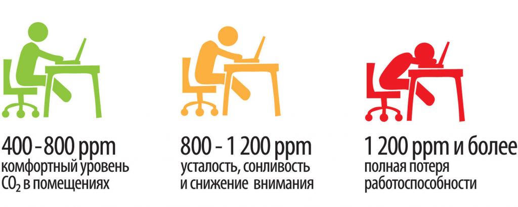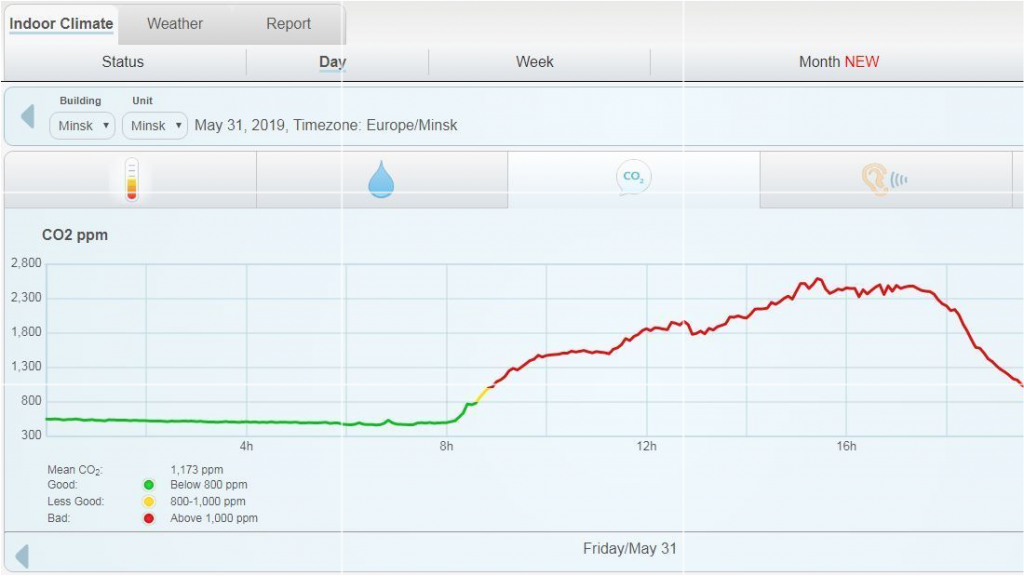 – Звычайна выдзяляюць тры ўзроўні: зялёны, жоўты і чырвоны. Добрае паветра, альбо зялёны узровень, каля 800. 800-1200 ppm – горш за норму, жоўты ўзровень, а 1200 ppm і больш – чырвоны узровень. Дзе б мы не рабілі вымярэнні, калі памяшканне не праветрываецца, то практычна ўсюду звычайна чырвоны ўзровень, радзей – жоўты.