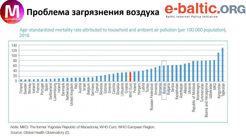В Беларуси, как видно на графике, достаточно высокий уровень смертности от загрязнения воздуха в сравнении с развитыми европейскими странами. Правда, нашу ситуацию ВОЗ оценивает как более благоприятную в сравнении со странами, входившими в СССР.