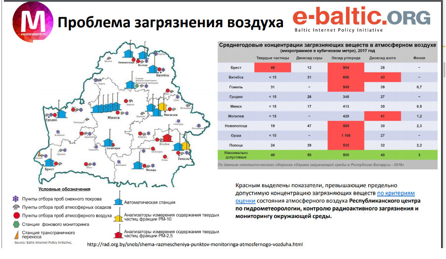 И даже довольно редко предоставляемые данные показывают, что Республиканский центр по гидрометеорологии, контролю радиоактивного загрязнения и мониторингу окружающей среды периодически фиксирует превышения предельно допустимых концентраций загрязняющих веществ в воздухе в Бресте, Витебске, Гомеле, Орше, Могилеве, Полоцке и Новополоцке.